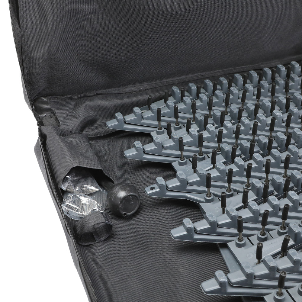 Shake the spike strip before folding so that materials such as grass and stones stuck in between fall out, allowing it to be folded easily.